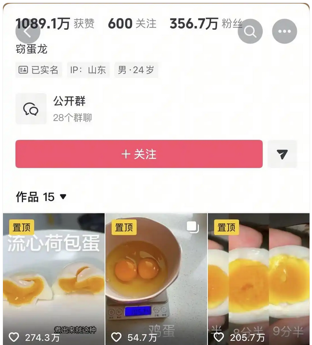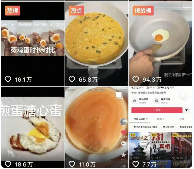 這個名為“愛吃蛋”的網友,就是馮先生。見大家如此關注,馮先生覺得拍視頻分享自己的煮蛋經驗。不同熟度的水煮蛋、平底鍋做的漫畫蛋、不散的荷包蛋、入口化的雞蛋羹……從12月4日發布第一條視頻,到12月11日,8天時間,15個視頻,獲贊上千萬,粉絲從0直接飆升到356萬,馮先生在小眾賽道成功出圈。