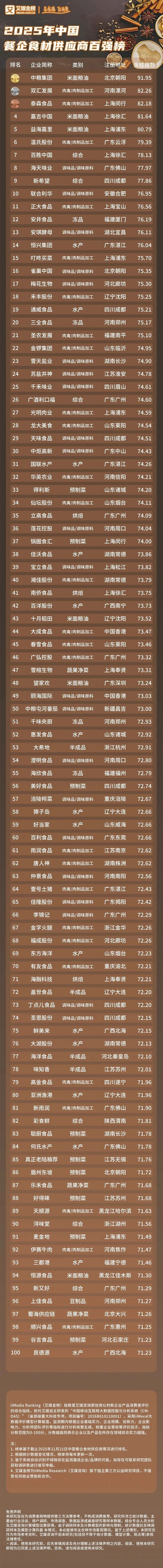 近日,艾媒咨詢發布《2025年中國餐企食材供應商百強榜》,榜單數據顯示,TOP20企業依次為:中糧集團、雙匯發展、泰森食品、嘉吉中國、益海嘉里、溫氏股份、百勝中國、海天味業、新希望、聯合利華、正大食品、安井食品、安琪酵母、恒興集團、叮咚買菜、雀巢中國、梅花生物、禾豐股份、通威食品、三全食品。其中,中糧集團、雙匯發展、泰森食品、嘉吉中國、益海嘉里分別以91.95、82.26、82.18、81.64、80.79的金榜指數排在榜單前五名。