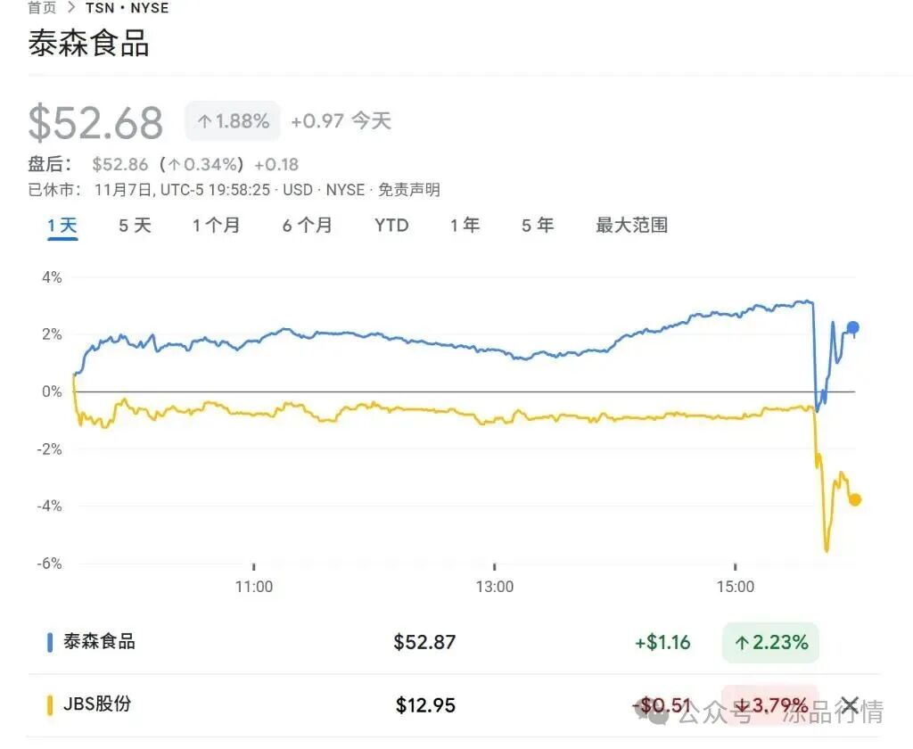 這一消息立即引發了相關公司股價的波動。在特朗普發文后不久,泰森食品和全球肉類巨頭JBS的股價雙雙跌至盤中低點。盡管泰森食品股價在收盤時反彈,最終上漲1.9%,但JBS當天收盤仍下跌3.6%,顯示出市場對潛在反壟斷調查的直接反應。