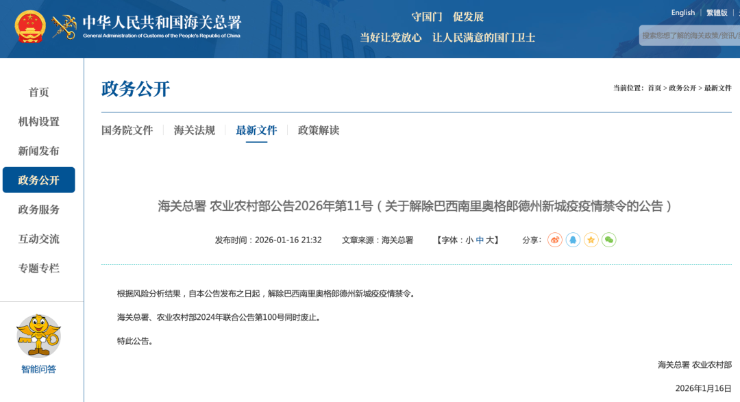 1月25日,海關總署正式更新輸華禽肉企業名單,巴西南里奧格朗德州8家禽肉工廠全面解禁,恢復巴西8家禽肉產品(注冊編碼為 :SIF103、SIF1661、SIF2014、SIF2032、SIF4017、SIF68、SIF922、SIF730)自2026年1月16日(含)后生產的輸華產品進口準入。