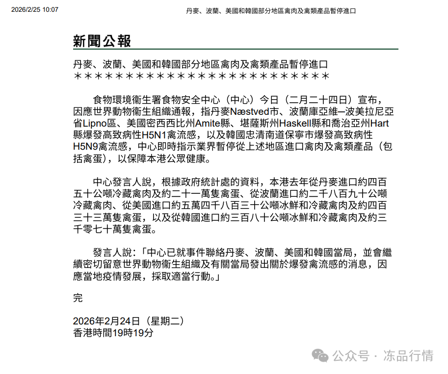 2月24日晚,香港食物環境衛生署食物安全中心(下稱“香港食安中心”)連夜發布通告,宣布即時暫停丹麥、波蘭、美國、韓國4個國家部分疫區的禽肉及禽蛋進口,直指H5N1、H5N9兩種高致病性禽流感的輸入風險,用最果斷的措施守住公眾健康防線。