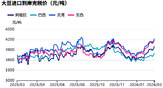 截至3月9日,巴西近月大豆到港完稅價上漲至3800元/噸左右(含3%關稅),低于美豆到港完稅價的5300元/噸左右(含13%關稅)。