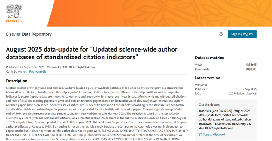 本次榜單評選依托斯坦福大學開發的科學計量學分析框架,綜合考量論文總引用量、h指數(衡量學術產出與影響力的核心指標)、合著者修正的hm指數(排除合作貢獻的個體影響力評估)、獨立及第一作者論文引用量等六項核心指標。評選范圍覆蓋22個學科領域及174個子學科方向,從全球近700萬名科研人員中嚴格篩選,最終產生涵蓋"終身科學影響力"與"年度科學影響力"的雙維度榜單。