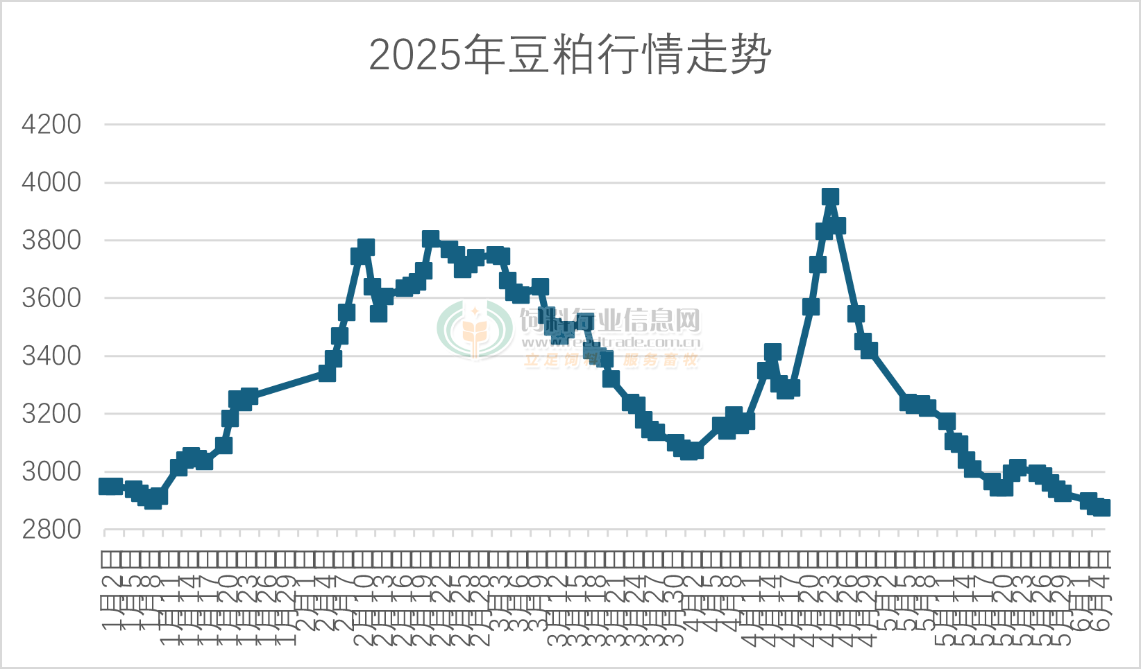據飼料行業信息網統計數據顯示,截止6月4日,全國重要大中型油廠43%蛋白豆粕現貨成交均價已經跌至2870元/噸,較4月下旬的高點下跌達1000元/噸,已經跌破年初低點,達2025年以來的最低價格。