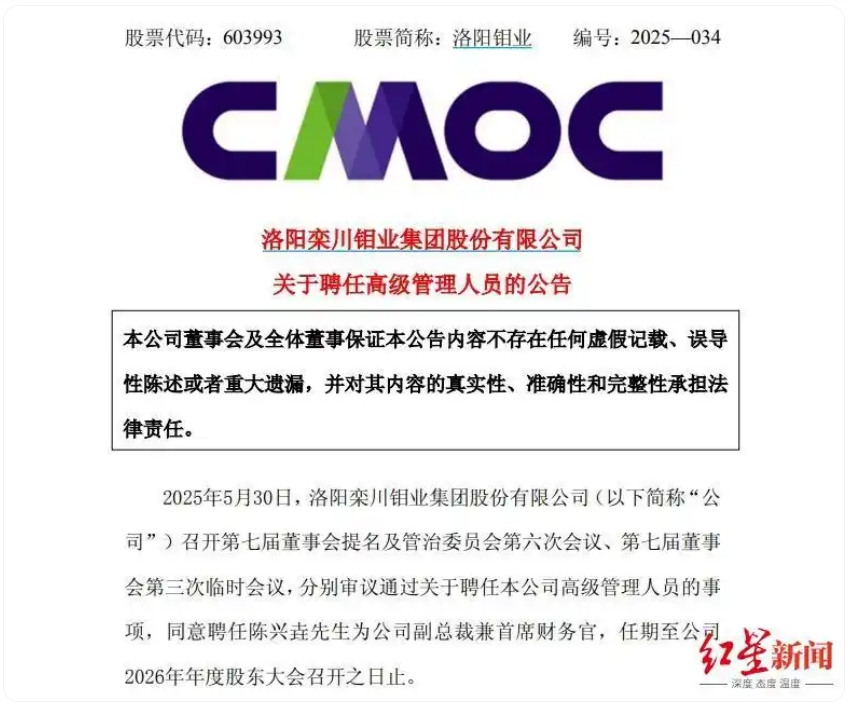 國內銅鈷巨頭洛陽鉬業5月30日晚間公告披露,公司聘任陳興垚先生為副總裁兼首席財務官,任期至公司2026年年度股東大會召開之日止。