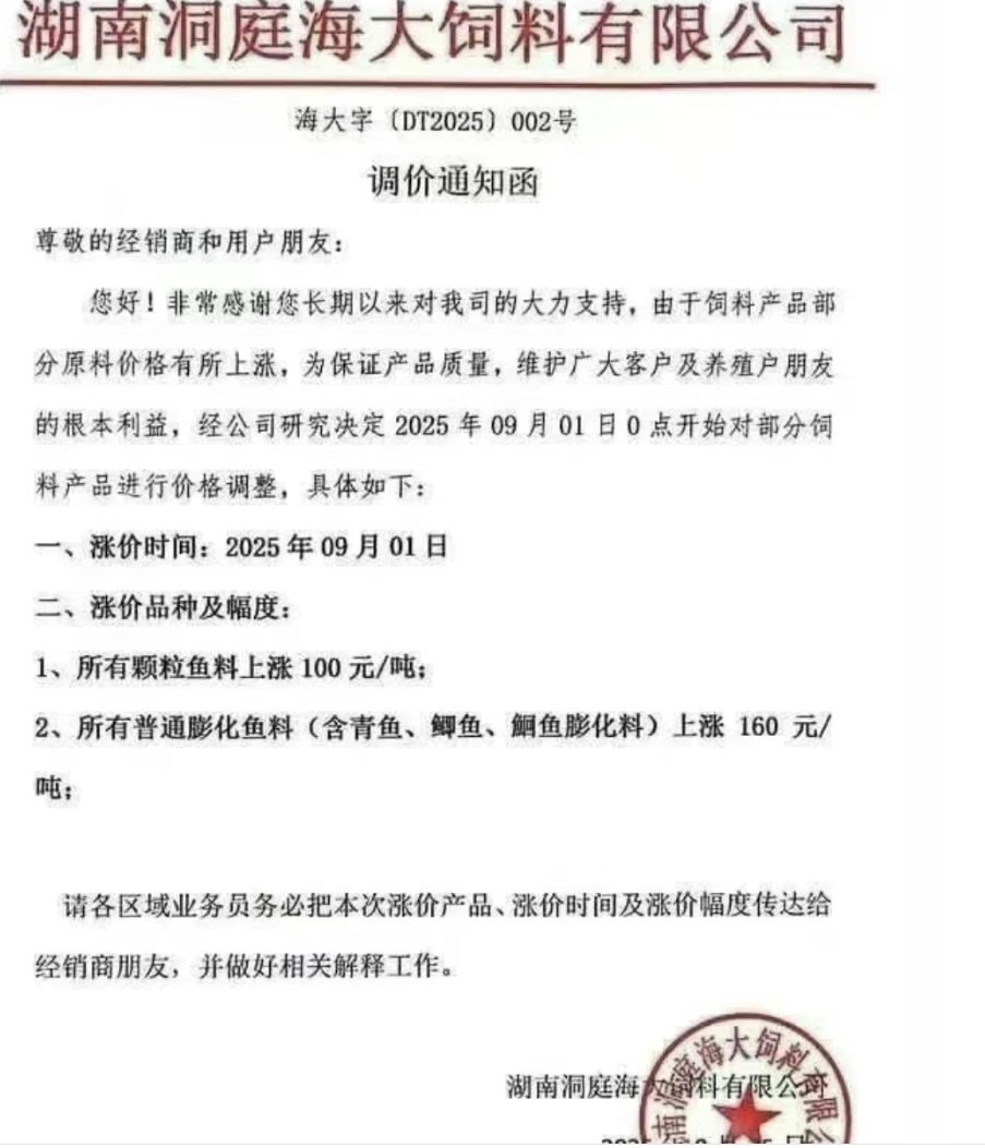 據悉9月1日起多家水產企業漲價,其中有海大、通威、駱駝等企業。上漲原因主要由于原料漲價。漲價市場是華中的湖南地區,上漲品種主要是普通顆粒料和膨化料,上漲了100-160元。