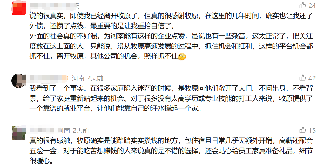 如今,不斷有人進入牧原,也有人離開牧原,但是網友們的留言也更暖心,感謝牧原為很多人敞開了大門,不僅撐起了一個個家庭,也讓很多人掌握了技術,重拾了自信,是一家比較人性化的養豬企業。