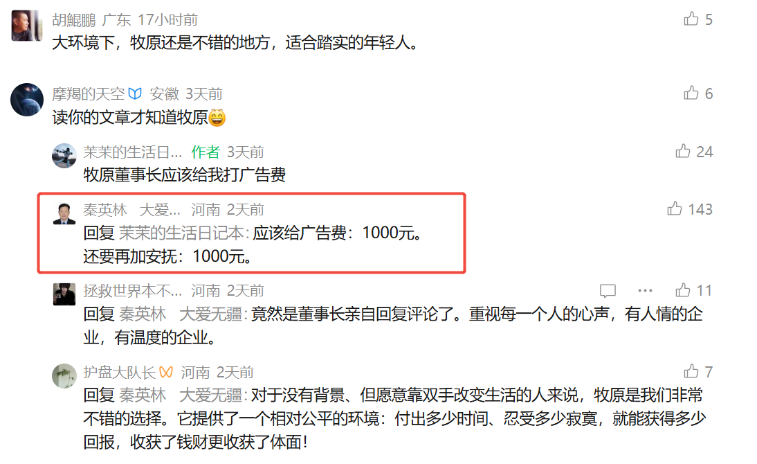 近日,一篇關于《一位牧原離職員工家屬的自述》火了。大家不僅從這篇文章中了解了牧原,而且這篇文章的評論區引來了牧原董事長秦英林的親自回復,這不單單是一句簡單的網絡互動,更是一個企業領導人對基層員工、對普通家庭的鄭重回應。