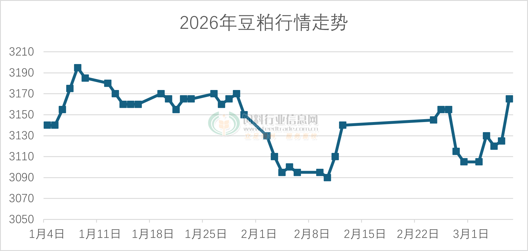 中東戰局沖突持續擾亂原油供應,國際原油期貨價格繼續飆升,創下自2024年7月8日以來的最高水平,導致海運費成本增加,并帶動豆油及大豆期貨價格的上漲。受美盤大豆價格上漲帶動,今日連盤豆粕期貨價格高開高走,截止中午11:30收盤,連盤豆粕主力M2605合約收2915元/噸,大幅上漲78元/噸,漲幅達4.75%,其中最高達2922元/噸,為2025年12月3日以來的高點。