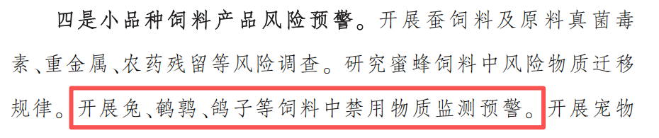 三是在小品種飼料產品風險預警方面,2025年只有兔飼料中禁用物質、違法添加藥物、超范圍使用獸藥的監測預警;2026年新增鵪鶉、鴿子等飼料中禁用物質監測預警。