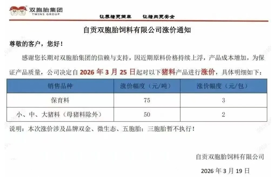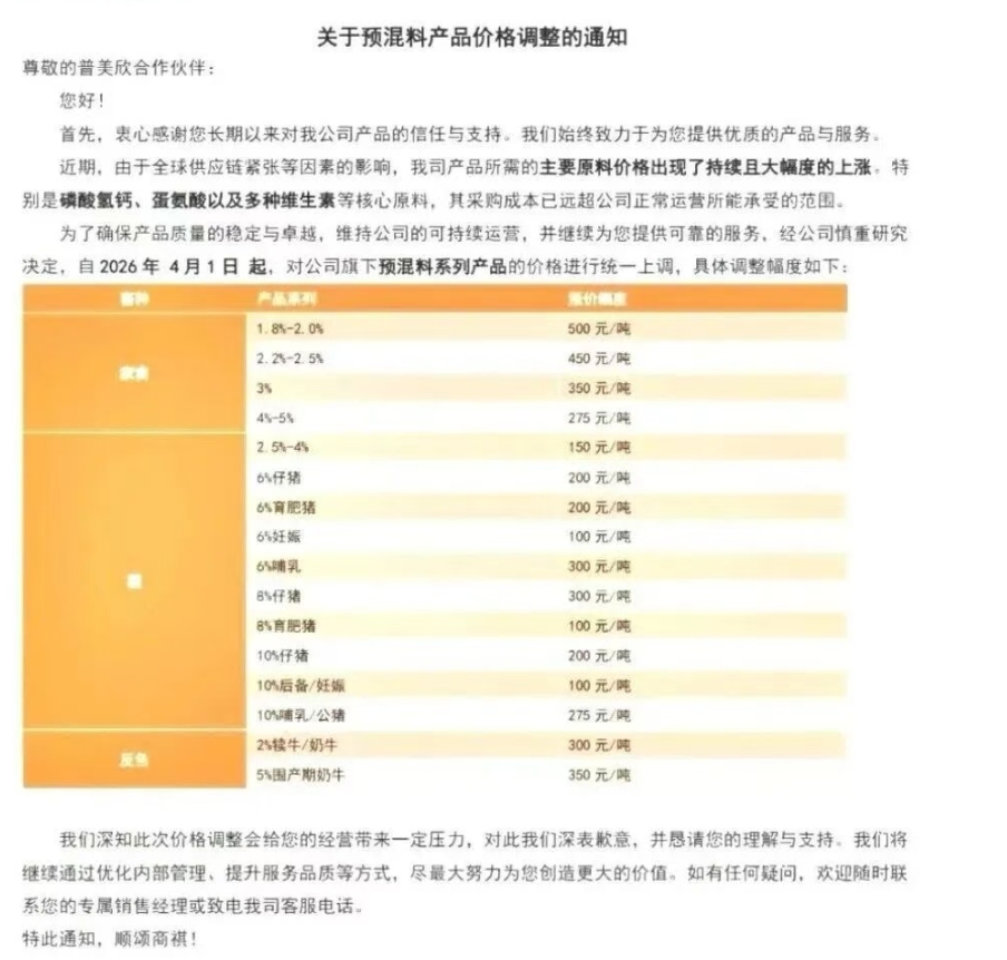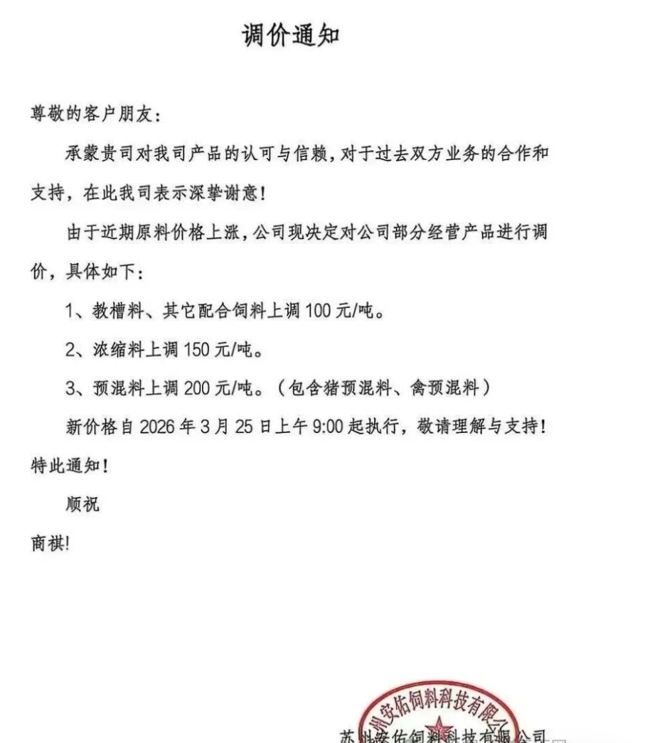 教槽料、濃縮料成為漲幅最高的品類,每噸上調100-125元;保育料每噸上調75-100元;小中大豬全價料、禽料、反芻精補料普遍上調50-75元/噸。其中貴州和美、貴州全邦等多家企業明確表示“不接受預付款”。