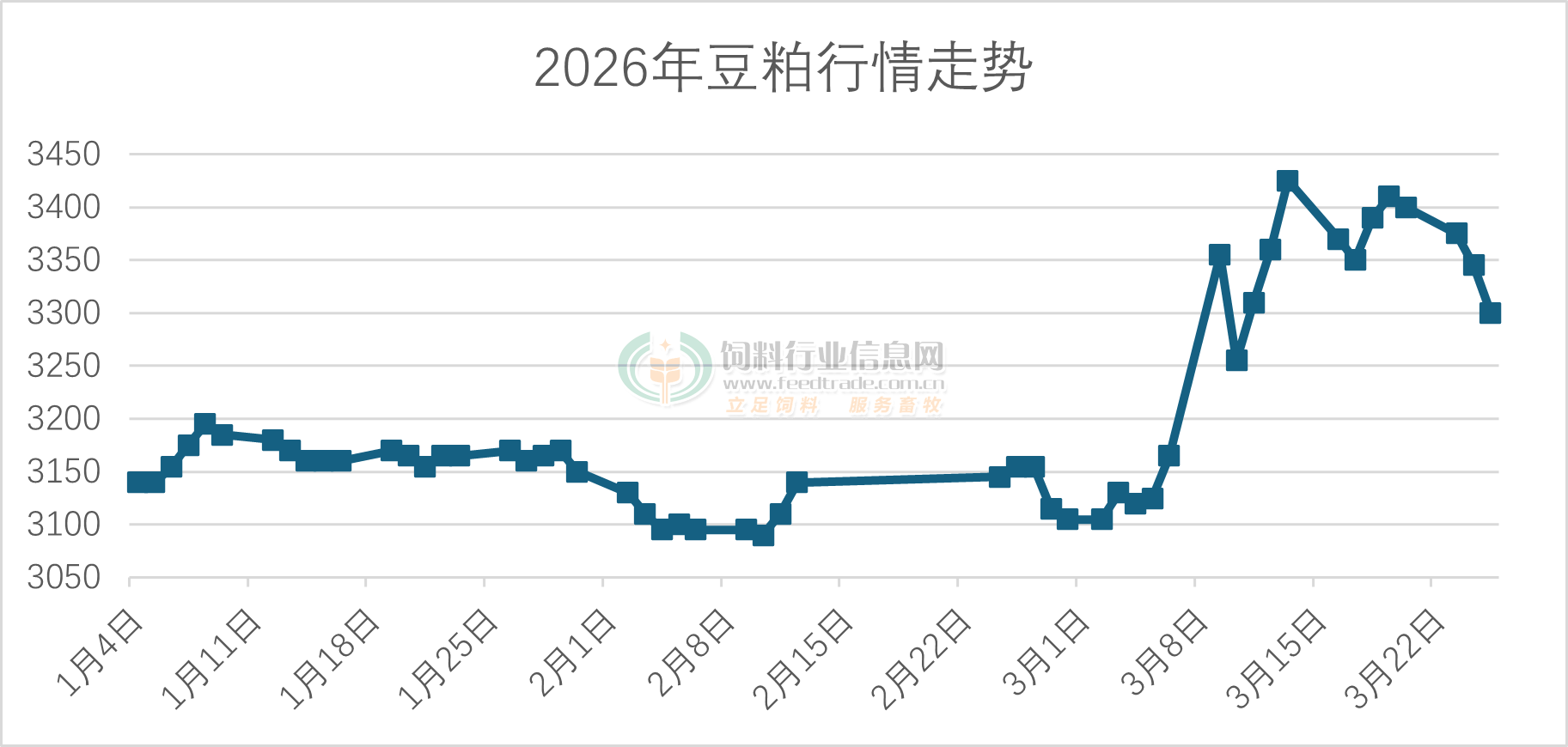 近幾日豆粕連續下跌。今天豆粕現貨均價為3300元,跌45元。其中江蘇地區價格為3260-3280元,跌20-40元,山東地區價格為3320-3300元,跌40元。