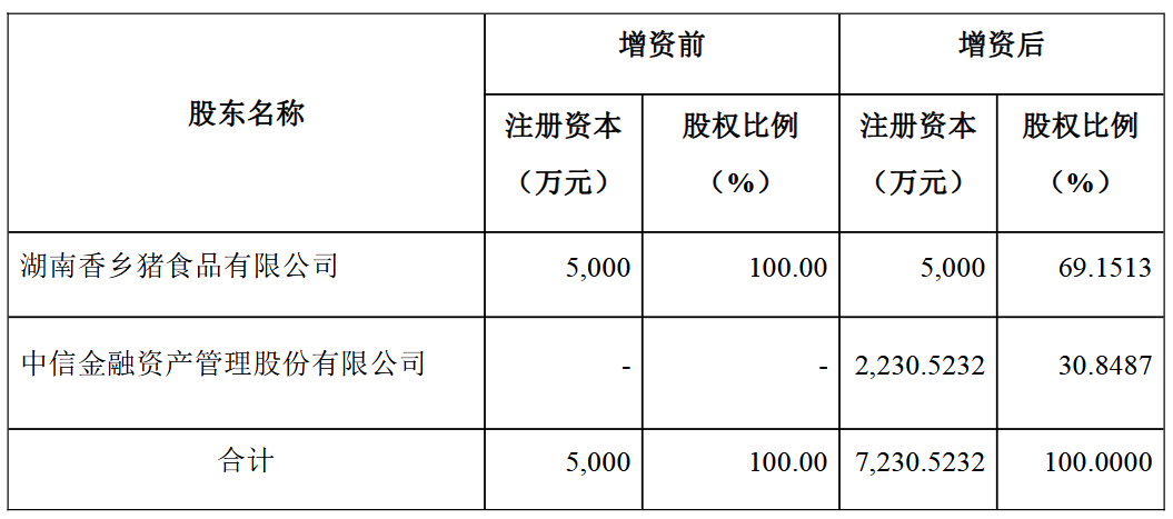 另外,3月25日晚間,唐人神發布公告,中國中信金融資產管理股份有限公司擬對唐人神的子公司”龍華農牧“現金增資 20000萬元,認繳龍華農牧新增注冊資本 2,230.5232 萬元。本次增資后,龍華農牧的注冊資本由 5,000 萬元增加至 7,230.5232 萬元,中信金融資產持股比例為 30.8487%。本次增資擴股前,香鄉豬食品直接持有龍華農牧 100%股權,公司間接持有龍華農牧 100%股權。