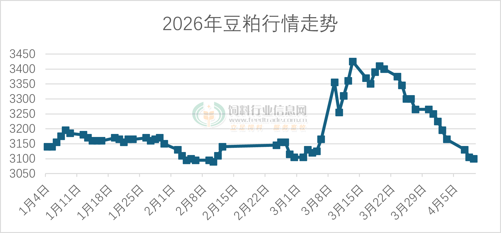 豆粕自3月中下旬展開下跌開始,已經累計下跌了275元,直到今天也并未有止跌的意向,依舊處于震蕩下跌中。目前豆粕現貨均價為3100元。其中今天江蘇地區豆粕價格為3000-3060元,跌了20元/噸。