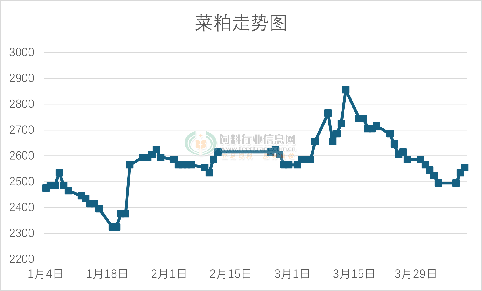 進入本周,菜粕價格已經連漲3天,菜粕現貨均價已經來到了2555元/噸,較4月7日上漲了60元,較昨日上漲了30元。