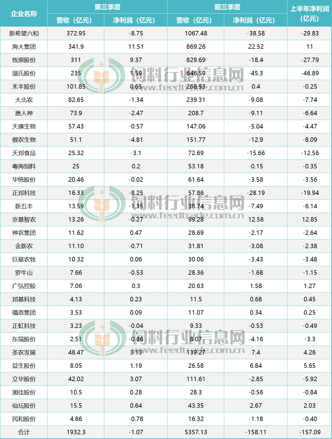 飼料行業信息網統計了30家上市農牧企業前三季度業績,其中一半企業第三季度虧損,且絕大部分是在上半年虧損的基礎上繼續虧,從前三季度的凈利潤來看,有21家企業仍然是虧損狀態,像牧原、溫氏、禾豐、巨星農牧在第三季度都實現了扭虧為盈;這30家企業中家禽企業業績在第三季度大部分實現了盈利或扭虧,只有民和股份小幅虧損。