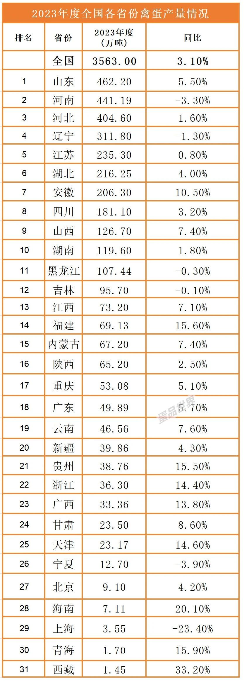 據國家統計局最新發布的數據顯示,2023年度我國禽蛋產量為3563萬噸,同比增長3.10%。山東、河南、河北、遼寧、江蘇禽蛋產量分別位于全國前五名;與2022年相比,2023年山東超越河南,禽蛋產量全國第一;2023年禽蛋產量增長最快的省份是西藏,增長幅度高達33.20%。