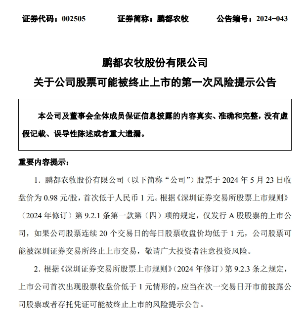5月23日鵬都農牧發布公告表示,公司股票于2024年5月23日收盤價為0.98元/股,首次低于人民幣1元。根據規定,如果公司股票連續20個交易日的每日股票收盤價均低于1元,公司股票可能被深圳證券交易所終止上市交易。