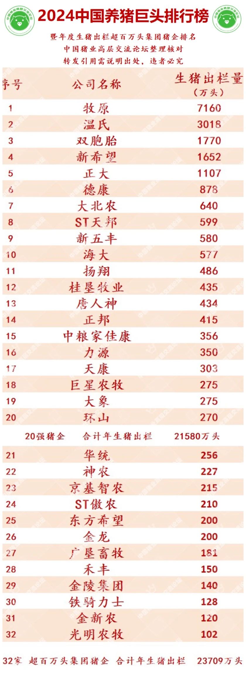 2024“百萬頭俱樂部”成員,多了東方希望、禾豐集團、光明農牧,少了湖南佳和、廣東天農集團。
