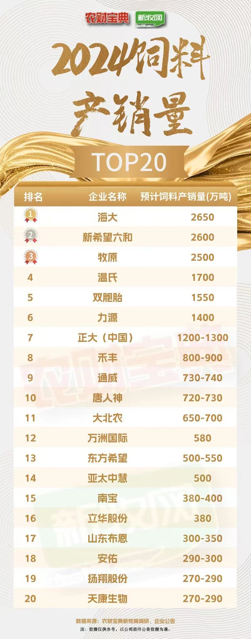 據新牧網發布,2024年飼料企業20強產量總和預計超2億噸,約占全國飼料總產量的65%。