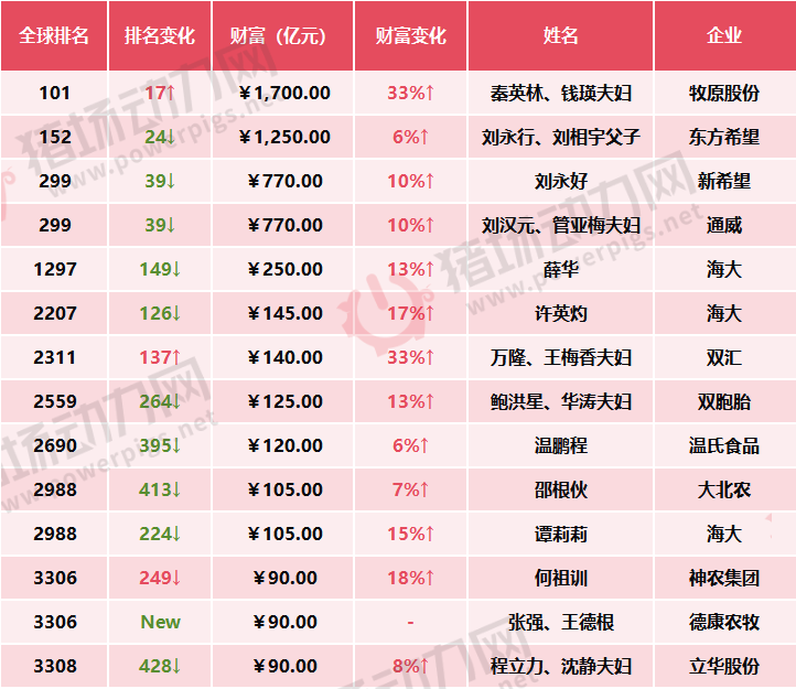 據統計,我國養豬行業相關的企業家個人及家族共上榜14人,財富合計5750億元,并且此次上榜的所有人身價都還在上漲!