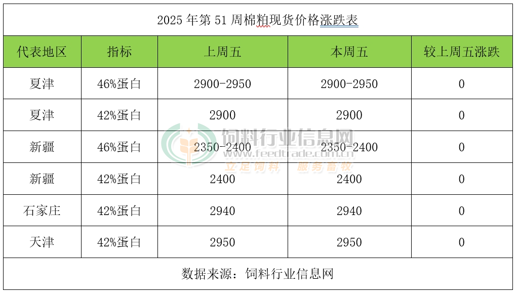 本周棉粕價格整體穩定。中國需求放緩以及巴西大豆豐產預期令美盤大豆持續承壓,帶動進口大豆跟隨下行,削弱成本端對市場的支撐。國內進口大豆拍賣后油廠供應充裕,在較高的開機率下豆粕產量較大,庫存維持高位,油廠挺粕動力不足,維持震蕩調整行,利空棉粕行情,削弱棉粕需求。但是棉粕成本端存在支撐,令棉粕難以下跌。此外,在供應方面棉粕壓力不大,利好棉粕。短期棉粕難有大幅波動,繼續震蕩調整,繼續關注豆粕走勢對其指引。截止目前,山東46%蛋白棉粕參考報價2900-2950元/噸,穩定;新疆46%蛋白棉粕參考報價2350-2400元/噸,穩定。