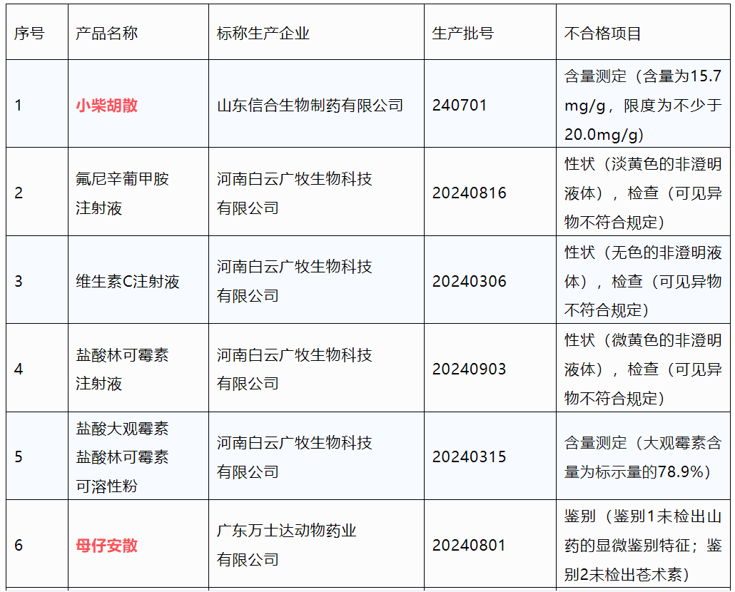 以下摘自《2025年第二季度獸藥質量監督抽檢情況的通報》文件內容: