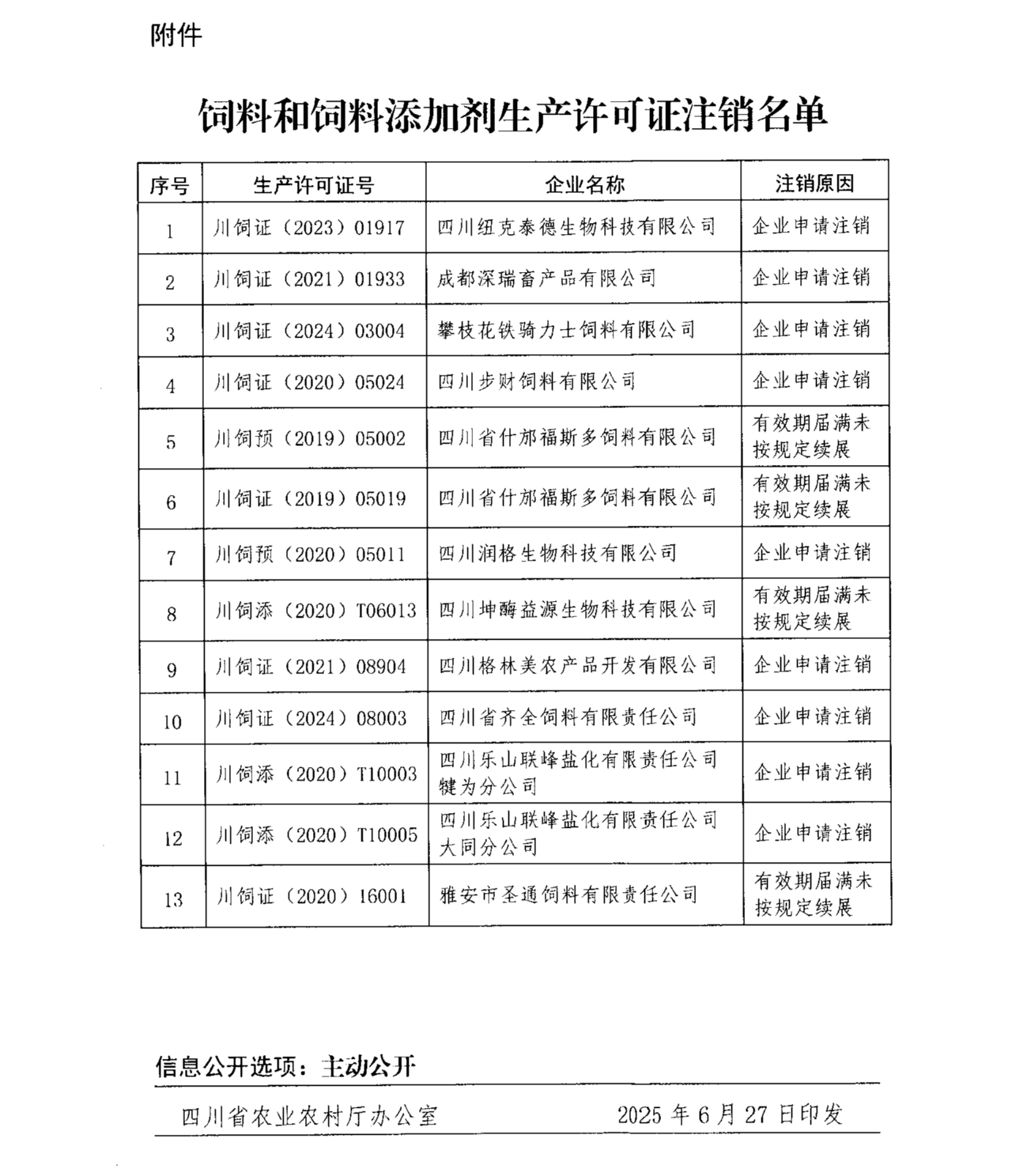 導語:四川注銷13家飼料和飼料添加劑企業生產許可證