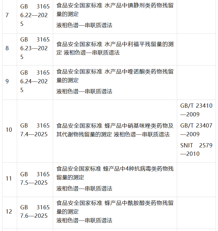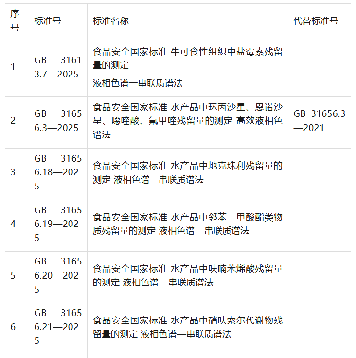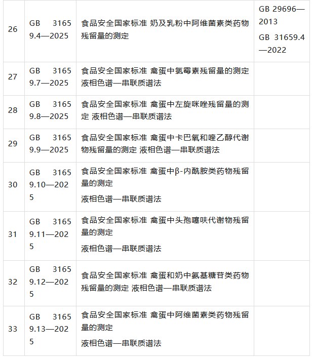 根據《中華人民共和國食品安全法》規定,經食品安全國家標準審評委員會審查通過,現發布33項獸藥殘留檢測方法食品安全國家標準,自2025年9月1日起實施。標準編號和名稱見附件,標準文本可于發布之日起2個月后在農業農村部農產品質量安全中心網站(http://www.aqsc.agri.cn)查閱下載。