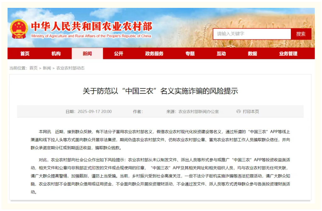 對此,農業農村部向社會公眾作出如下風險提示:農業農村部從未以制發文件、派出人員等形式參與或推廣“中國三農”APP等投資收益類活動,相關文件和公章均非我部正式印發的文件或合規使用的印章,“中國三農”APP及其相關網址和相關組織人員,均與農業農村部無任何關聯,請廣大群眾提高警惕,加強甄別,謹防上當受騙。當前,鄉村振興受到社會高度關注,一些不法分子趁機實施詐騙等違法犯罪活動,請廣大群眾知曉,農業農村部不會面向群眾借用或征用資金,不會面向群眾開展投資理財活動,不會通過發文件、派人員等方式誘導群眾參與各類投資理財類活動。