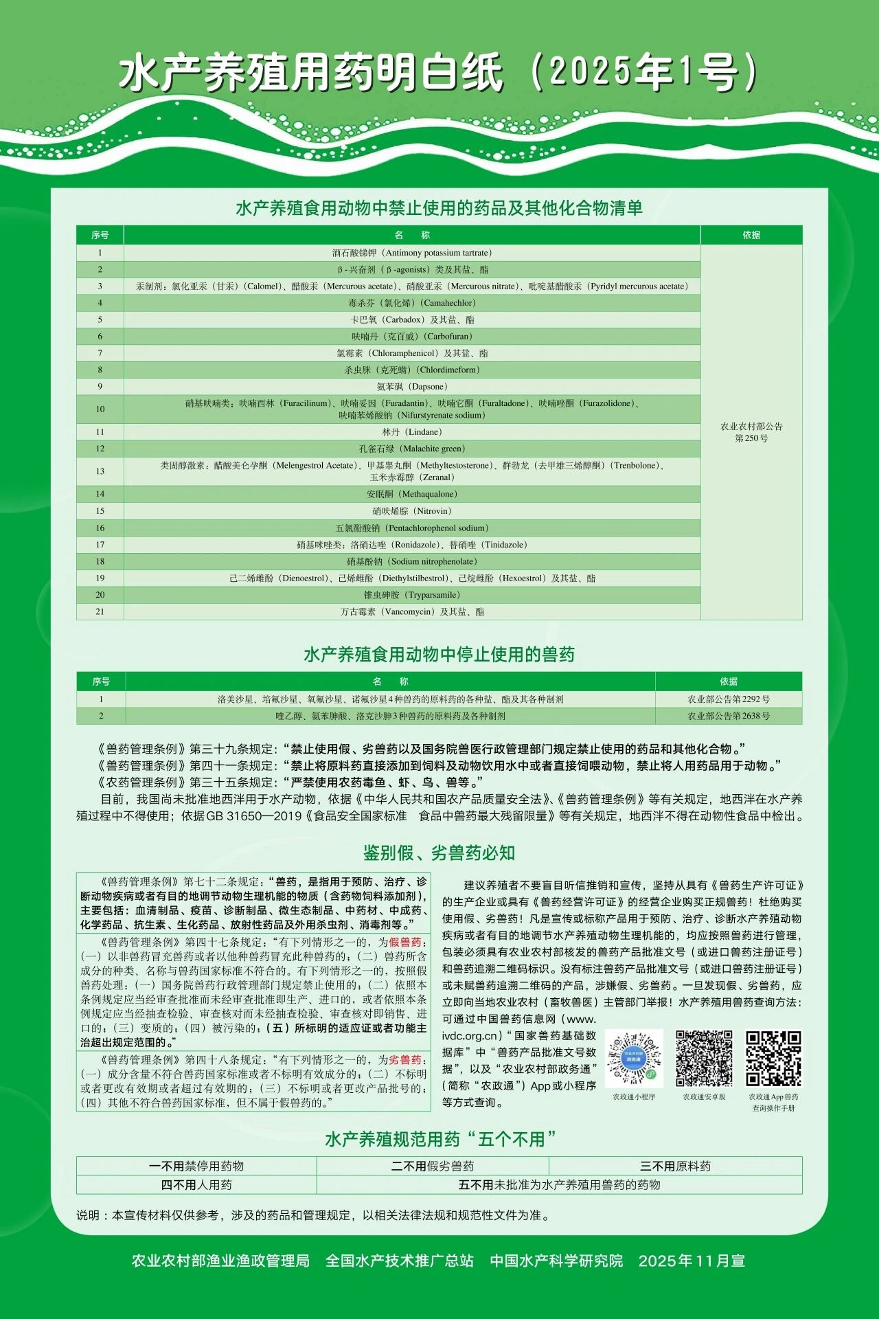 近日,《水產養殖用藥明白紙(2025年1、2號)》發布。為做好水產養殖規范用藥指導,防范水產品中藥物殘留超標,進一步提高質量安全水平,農業農村部漁業漁政管理局組織全國水產技術推廣總站、中國水產科學研究院等單位,重新梳理水產養殖用藥相關規定、標準,對《水產養殖用藥明白紙(2024年1、2號)》進行修訂,增列獸藥制劑適用水產動物、主要活性化合物最大殘留限量等指標,增加芪翁黃柏散、姜黃提取散等新批準藥物,形成《水產養殖用藥明白紙(2025年1、2號)》。請各地組織做好宣傳培訓,將規范用藥理念和技術要求送到漁民中間,切實提高養殖主體質量安全主體責任意識和藥殘限量達標意識。
