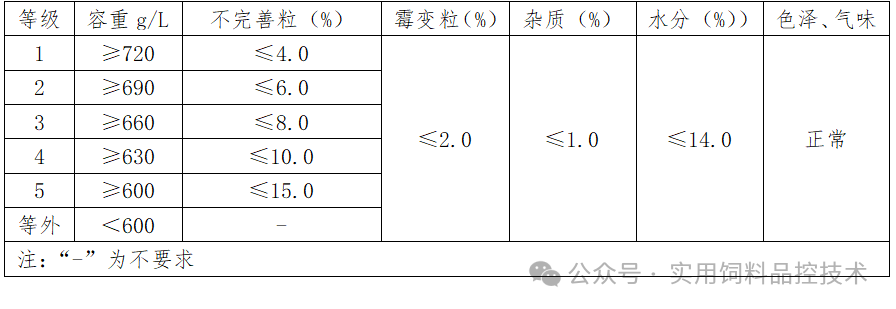 《玉米》(GB 1353-2018)是強制性標準,由國家糧食和物資儲備局提出并歸口,對玉米的容重、不完善粒、分類、雜質、色澤、質量要求和衛生要求、檢驗方法、標簽、包裝、儲存和運輸等方面做出規定。在這三個標準中,只有這個標準提出了玉米霉變粒的要求,其他兩個標準中只有生霉粒的要求,并且只有這個標準規定了不完善粒中的哪些生霉粒不應判定為生霉粒。該標準對玉米的質量等級要求如下: