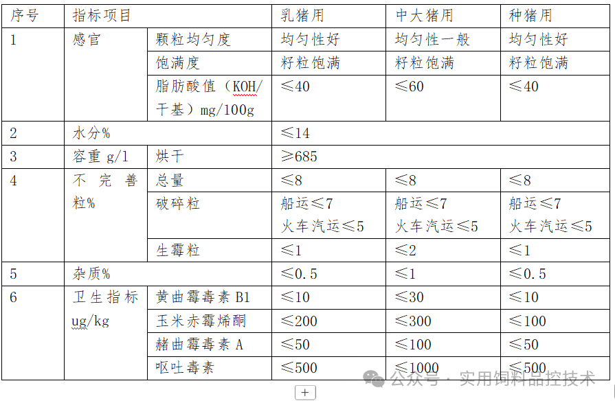 《豬飼用玉米》(CGBA-1-2016)是由中國糧食商業協會提出并歸口,是在以上兩個標準的基礎上進行了修訂和升級。該標準將玉米分為乳豬用、中大豬用、種豬用三個類別,并且增加了顆粒均勻度、飽滿度2個感官指標,同樣對脂肪酸值做出要求。其對玉米的質量要求如下:
