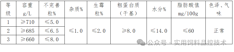 《飼料用玉米》(GB/T 17890-2008)是推薦性標準,是全國飼料工業標準化技術委員會提出并歸口,主要對飼料用玉米的定義、要求、抽樣、檢驗方法、規則、包裝、儲存和運輸等方面做出規定。只有這個標準對玉米的粗蛋白質含量做出了要求,并且提出了脂肪酸值的要求。該標準對玉米的質量等級要求如下: