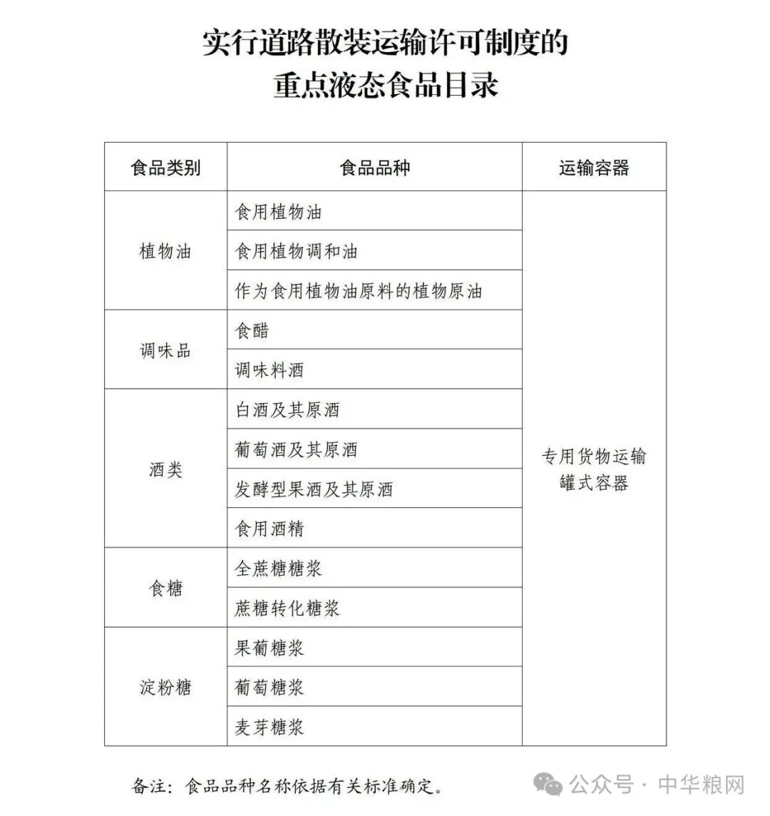 市場監管總局、交通運輸部、國家糧食和儲備局以聯合公告形式發布的《實行道路散裝運輸許可制度的重點液態食品目錄》明確將5大類14小類液態食品納入準運許可管理范圍,包括植物油、調味品、酒類等,同時明確規定運輸容器為專用貨物運輸罐式容器。