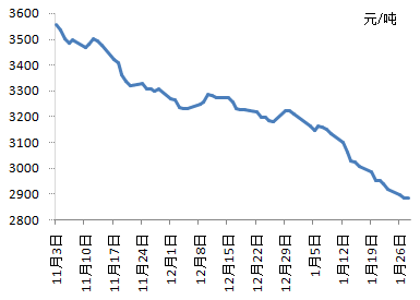 如圖所示,國內豆粕價格從2014年11月起便出現一蹶不振的走勢,從近3600元/噸下跌至2900元/噸左右,跌幅達700元/噸。國內豆粕價格的下跌是由于美盤大豆走勢下滑承壓以及下游需求市場疲軟所致。元旦后生豬出欄加快,存欄量或繼續下降,加上東南沿海出現的禽流感疫情使得國內飼料企業銷售量縮減,各地企業備貨意愿較弱,這些因素均將繼續壓制國內豆粕價格,豆粕后市易跌難漲。