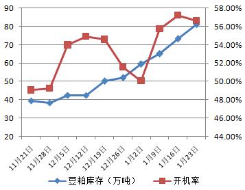 從油廠豆粕庫存來看,自2014年11月下旬開始,國內油廠豆粕庫存從38萬噸攀升至85萬噸左右。主要由于國內大豆壓榨數量較大,生產的豆粕數量較多,加上近期出貨速度緩慢,趕不上豆粕生產速度,部分油廠出現豆粕脹庫停機的現象。