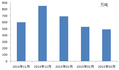 為了避免備貨不足導致后期進口高價大豆的情況出現,今年油廠采購大豆有所提前且積極性較高,導致國內大豆到貨數量較大。2014年12月我國進口大豆數量為853萬噸,同比增長15.3%,較11月增長41.5%。2014年全年進口大豆總量7140萬噸,同比增長12.7%,為大豆進口量最多的一年。據大豆船期預報顯示,2015年1月到港數量預計在680萬-700萬噸,2月在520萬-540萬噸,3月在480萬-500萬噸,保守預計2015年1-3月大豆到港量將達1650萬噸,較去年同期增長近150萬噸。春節過后一般為豆類消費淡季,如此龐大的大豆供應量使市場供應略為寬松,再加上今年的需求旺季不旺,近期國內大豆供應無壓力。