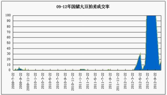為滿足市場需求,平抑不斷高企的大豆價格,以及騰出庫容繼續收購,2009年夏季開始,國儲開始拍賣儲備大豆。自2009年國家臨儲移庫大豆競拍開始實行至2012年共進行67次臨儲移庫大豆競拍,累計近2632萬噸,實際成交只有381.1227萬噸,成交率僅為13.95%。其中2009年國儲拍賣18次,成交14次,成交均價3700元/噸,4次流拍。2010年國儲拍賣3次,全部流拍。2011年國儲拍賣21次,成交3次,18次流拍,2011年大豆競拍累計693.47萬噸,成交1.61萬噸,成交均價3966元/噸,成交率1.83%。2012年國儲拍賣24次,成交19次,只有五次流拍。2012年大豆競拍累計1038.38萬噸,成交368.13萬噸,成交均價4144元/噸,成交率45.83%。由圖二可以看出,2012年成交明顯好轉,2012年因南美干旱炒作,進口大豆價格不斷上漲,最高的可達5100噸左右。國儲拍賣多次成交率為100%,成交量高達40多萬噸,在一定程度上維護了油廠的利益,產區國產大豆上市以后,國儲停止拍賣,穩定市場。前幾年拍賣情況一直難以令人滿意,因拍賣效果不佳,也為了扶植國內大豆加工企業,國家也曾推出一次性補貼政策來增加拍賣的成交率。由于南北美大豆減產的累加效應,全球大豆供應趨緊,2012年國儲大豆拍賣情況明顯好于往年。截止2012年年底為止2008年收儲大豆已經全部拍賣完畢。