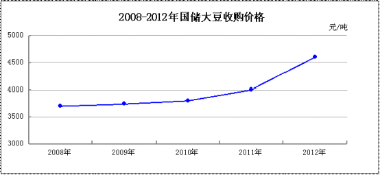 2008年國產大豆豐產,正逢全球金融危機,國家為防止谷賤傷農,扶持三農發展,實行收儲政策。2008年國家公布四次收儲計劃,收購總量757萬噸,約占國內總產量1550萬噸的46%左右,占東北產量的70%,其中150萬噸為中央儲備,余下的500多萬噸為臨時儲備,收儲價格3700元/噸。2009年大豆收儲改革,把企業也納入收儲范疇,企業每售出一噸大豆,國際給予160元補貼。收儲價格也提高至3740元/噸,但當年大豆收儲量比較有限,預計收儲量在200萬噸左右。2010年大豆收儲再次實行改革,不限制收購量,只限制售出時間,收儲價格再度提高至3800元/噸,根據官方數據公布,收儲量為300萬噸左右。2011年,國家敞開收購大豆,收儲價格提高至4000元/噸,收儲量在300萬噸左右。2012年,國家敞開收購,根據市場情況研究決定,將收儲價格定為4600元/噸,截止2013年4月5日國家糧食局統計國內主產區共收購大豆353萬噸左右,收購期到4月30日截止。