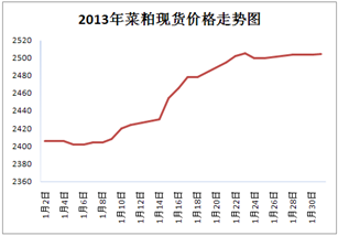 2013年第2周(1.07-1.11),國內菜粕現貨價格漲勢明顯。主要由于菜籽菜粕期貨上市走勢較 為強勁,并且油廠庫存較為有限,拉動了菜粕現貨的上揚;盡管國內豆粕價格受美豆拖累表現較弱,但對菜粕的弱勢影響十分有限。