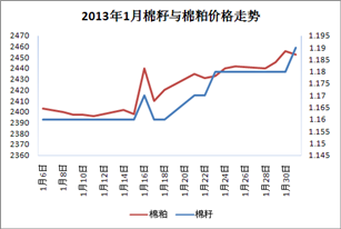 2013年第4周(1.21-1.25),國內棉粕市場震蕩下行,成交情況良好;前期受節前備貨帶動, 棉粕市場整體處于高位,出貨較快,提振市場價格。此外,棉籽行情表現依然堅挺,產品回暖使得廠家采購棉籽較為積極,同時新增資源量稀少,供需關系支撐其價 格,對棉粕市場形成支撐。后期由于外盤下跌,打壓國內粕類市場,且節前備貨收尾,需求方面較前期有所緩和,導致棉粕價格出現小幅回落現象。