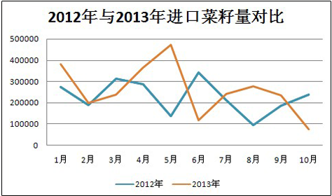 2013年菜籽進口量高于2012年,市場預計2013年我國菜籽進口量或接近350萬噸,后期仍在不斷增加。 2012年我國菜籽進口量多數來自于加拿大,內蒙古也有少量進口,其中加拿大共進口354.738萬噸,占2012年進來總量的95%。2013年國家改變了菜籽進口政策,開放了對澳大利亞、內蒙古、俄羅斯等地的菜籽進口,截止10月份加拿大共進口菜籽191.29萬噸,占目前進口總量的73%;澳大利亞進口菜籽67.15萬噸,占進口總量的26%;蒙古進口量較少,共進口1.171萬噸,占總量的1%。由于國內菜籽收收儲政策支撐,菜籽現貨價格上漲,油廠對國內菜籽采購持觀望態度,寄希望于進口菜籽身上,帶動油菜籽進口量不斷增加。 |