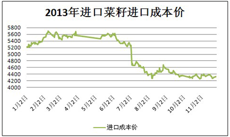 2013年進口菜籽成本價在年初漲勢較為強勢,后期進口菜籽成本價格下跌。1月至2月底上漲500元/噸,由于2012年全球菜籽產量下降,而國內對菜籽需求強勁,市場上菜籽呈現供不應求格局,導致2013年初全球菜籽價格上漲,國內進口菜籽成本價格隨之上漲。3-6月菜籽進口成本價較穩定,加拿大進口菜籽到港成本價格為5200-5600元/噸。 6月中旬-12月進口菜籽成本價格持續下跌:由于國內油菜籽進入收割期,國內菜籽供需充裕,油廠對外界油菜籽需求減少;下半年全球油菜籽豐產以及全球大豆豐產,打壓全球油菜籽價格,同時導致國內菜籽進口成本價下跌。 |