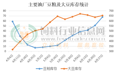 雖說在6月終端飼料養殖企業需求良好且有不少合同被提走,導致在工廠偏高的豆粕產量下庫存增加速度仍然緩慢,前期仍然維持在同期偏低水平。不過隨著后期終端已經有一定庫存,且市場繼續拿貨需求不及工廠豆粕產量,庫存出現持續第九周增加。據監測數據顯示,截止6月27日,主要油廠豆粕庫存68萬噸,較2024年同期仍下降39萬噸,仍處于歷史同期較低水平。隨著工廠開機壓榨量持續維持高位,豆粕產量較高,預計豆粕庫存將繼續處于增加的趨勢。