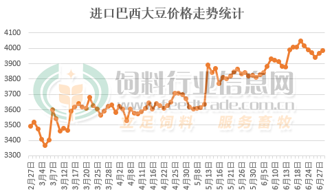 因中國在對進口美國大豆增加關稅后,中國進口的大豆主要來自于南美的巴西,但受美盤大豆價格上行后,進口巴西大豆升貼水價格也出現了明顯的上行,最終導致到港的巴西大豆價格上漲,從而在成本端對豆粕市場提供支撐。據統計數據顯示,進口巴西大豆價格6月初在3600元/噸,隨著后續升貼水上漲,月底到港的巴西大豆成本已經逼近3900元/噸,且后期價格仍在上行。