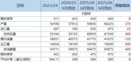 美國2025/26年度豆粕產量預估上調為6022.5萬短噸,8月預估為5985萬短噸。2024/25年度9月預估為5791.2萬短噸。2023/24年度為5410.6萬短噸。