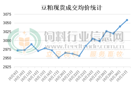 受進口大豆成本跟隨美盤大豆上行,油廠壓榨效益不佳但養殖端需求逐漸好轉提振,增強了油廠對豆粕的提價意愿,豆粕價格在上中旬震蕩調整后,在下旬出現偏強走勢。據飼料行業網豆粕分析師統計,豆粕價格在月中時回調至2950元/噸低點后出現偏強反彈行情,最終在月底漲至3050元/噸以上,最終10月主要油廠43%蛋白豆粕成交均價2990元/噸,較9月均價下跌32元/噸,下跌幅度為1.09%。具體分析如下: