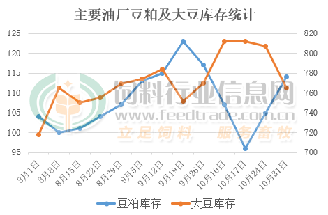 因近期進口的大豆到港數量仍然較多,供應比較充裕,加上國慶及中秋長假期間不少油廠停機放假導致壓榨數量下降后大豆庫存攀升,同時豆粕產量下降后庫存出現下降;不過隨著后期油廠開工率逐漸恢復后壓榨數量增加,壓榨量一定的大豆后庫存才開始下降,而豆粕出貨緩慢后庫存再次攀升,維持在較高的水平。據監測數據顯示,截止10月31日全國主要油廠進口大豆庫存765萬噸,同比增加153萬噸,較過去三年均值高309萬噸;豆粕庫存為114萬噸,叫2024年同期增加15萬噸,較過去三年同期均值還高51萬噸。因目前大豆供應充裕,豆粕產量較大但下游飼料養殖企業拿貨謹慎,豆粕出貨進度受限,油廠大豆及豆粕庫存繼續處于偏高水平,供應比較寬松。