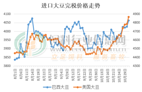 受中美經貿沖突影響,國內大豆買家自6月開始就未采購美國大豆訂單,進口的主要是南美大豆。不過隨著巴西等國的大豆可用于出口的數量有限,加之市場對中美談判前景樂觀影響,美國大豆對華銷售重啟,支撐美盤大豆價格上行,并帶動進口巴西大豆升貼水價格跟隨上漲,不過銷售緩慢后價格再次出現回調,中國買家抓住采購了一批大豆船期。據統計數據顯示,進口巴西大豆價格9月底在3900元/噸,后震蕩偏強運行,10月底4060至元/噸,上漲超150元/噸。進口美國大豆23%關稅的前提下,9月底在4430元/噸,后強勢上行,10月底已經漲至4850元/噸之上,上漲達420元/噸。